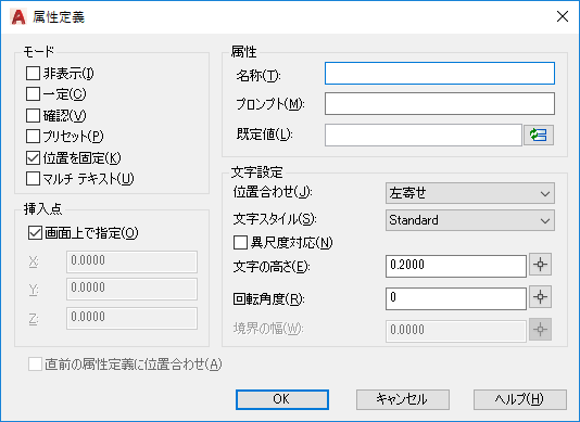 属性文字の位置合わせ、文字スタイル、高さ、回転を設定します。