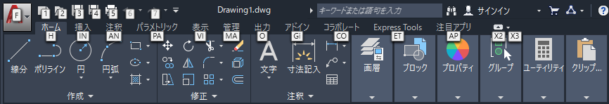 ポインティング デバイスの代わりにキーストロークを使用し、メニュー、クイック アクセス ツールバー、およびリボンで選択を行えます。現在のワークスペースで使用できるキーストロークを確認するには、[Alt]キーを押します。