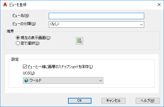 現在のビューポートの表示画面から、または矩形の窓を定義することにより、名前の付いたビューを新規登録します。