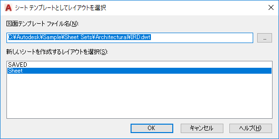 新しいシートに使用する図面テンプレート ファイル内のレイアウトの名前が一覧表示されるので、その中から指定します。