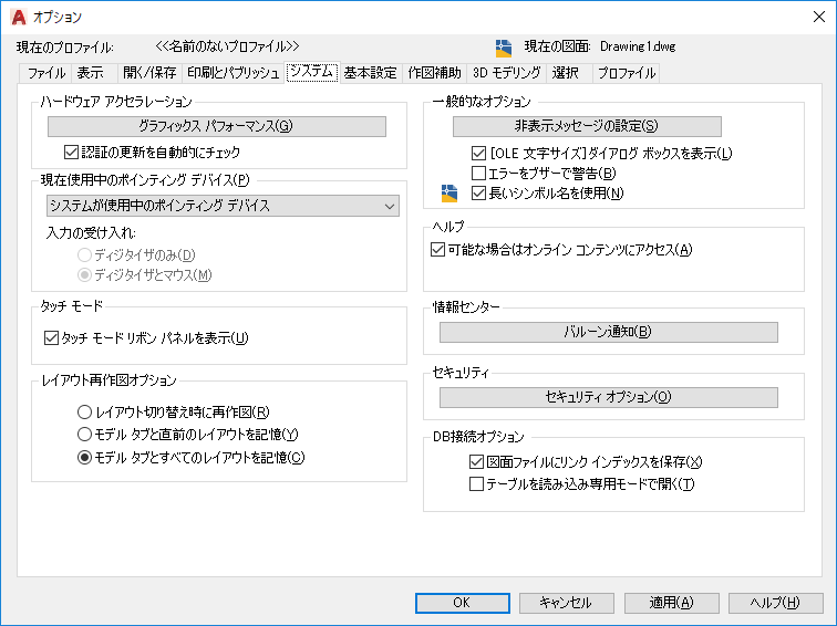 タブごとに、そのタブに切り替えたとき図面を再作図するか、そのタブに切り替えたときにディスプレイ リストをメモリに保存して変更されたオブジェクトだけを再作図するか、いずれかの方法によってディスプレイ リストが更新されます。この設定を変更すると、パフォーマンスを向上させることができます。(システム変数 LAYOUTREGENCTL)