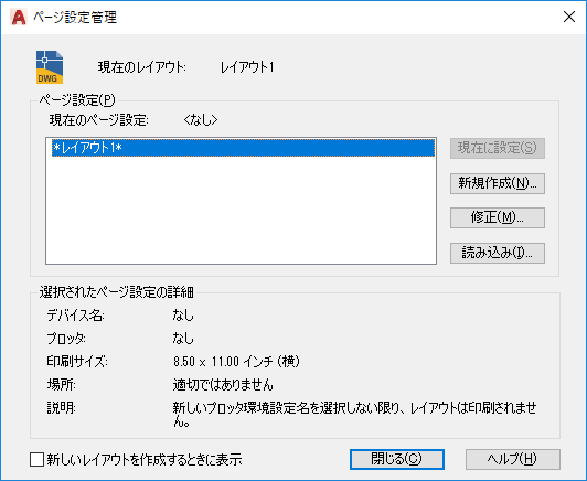 現在のページ設定が表示されます。別のページ設定を現在のページ設定にしたり、新しいページ設定を作成したり、既存のページ設定を修正したり、他の図面からページ設定を読み込みます。
