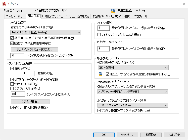 SAVE[保存]、SAVEAS[名前を付けて保存]、QSAVE[上書き保存]、WBLOCK[ブロック書き出し]コマンドを使用してファイルを保存するときに使用される有効なファイル形式が表示されます。このオプションで選択したファイル形式は、保存する図面の既定の形式になります。