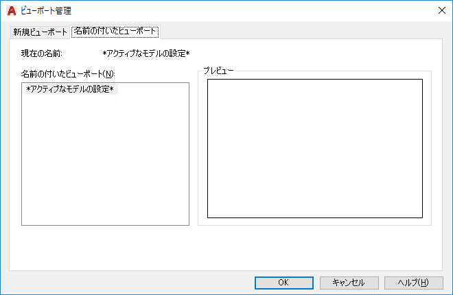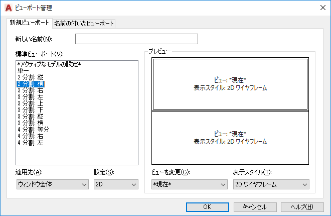 新しいモデル空間ビューポート設定の名前を指定します。名前を入力しない場合、作成したビューポート設定は適用されますが登録されません。ビューポート設定を登録しないと、レイアウトで使用できません。