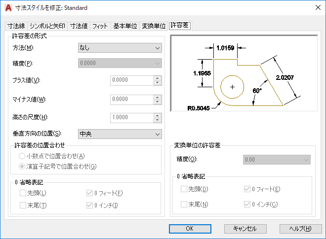 数値の先頭と末尾の 0(ゼロ)、およびフィート-インチ表記での 0(ゼロ)の省略をコントロールします。(システム変数 DIMTZIN[寸法許容差 0 省略])