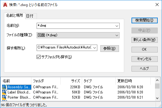 検索対象のファイルの種類は[タイプ]リスト ボックスで指定しますから、[名前]ボックスにはファイルの拡張子を入力する必要はありません。たとえば、house102.dwg というファイルを検索するには、[名前]ボックスに house* と入力し、[タイプ]リスト ボックスから[図面(*.dwg)]を選択します。