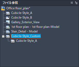 ツリー表示の最上位レベルには、常に現在の図面が表示されます。参照ファイルは次のレベルに表示されます。ネストされたファイル参照を含む参照ファイルは、開いて下位のレベルを表示できます。ツリー表示では、一度に 1 つのファイル参照しか選択できません。