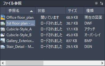 参照名の列では、常に最初のエントリとして現在の図面が表示され、その下に、その他のアタッチされたファイルがアタッチされた順番に一覧表示されます。