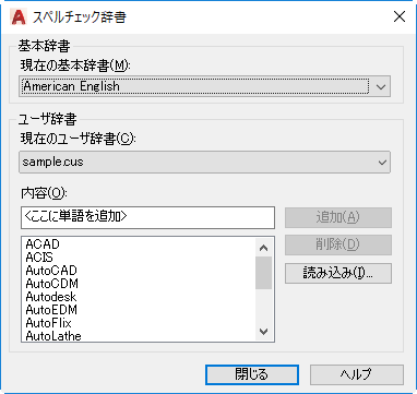 辞書を管理します。スペルチェック中は、図面内の単語と、現在の基本辞書およびカスタム辞書内の単語とが比較されます。[追加]オプションを使用して指定した例外スペルは、現在使用しているユーザ辞書に保存されます。
