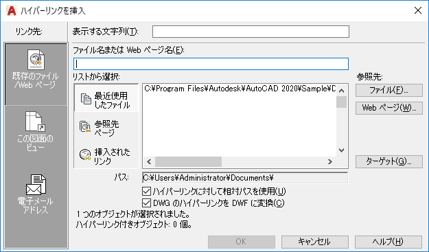 ハイパーリンクに関連付けたファイルへのパスが表示されます。[ハイパーリンクに対して相対パスを使用]チェック ボックスをオンにしているときは、ファイル名だけが表示されます。このチェック ボックスをオフにしているときは、絶対パスとファイル名が表示されます。