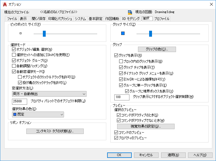 コマンドがアクティブでかつプロンプト「オブジェクトを選択:」が表示されているときにのみ選択のプレビューを表示します。(システム変数 SELECTIONPREVIEW)