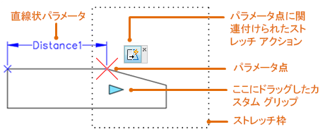 作図領域でのブロックの表示方法を決定するプロパティを追加します。パラメータのプロパティは、ブロック ジオメトリのグリップ、ラベル、プリセット値に影響します。アクションが連鎖されている場合、ジオメトリ オブジェクトにどのような影響が及ぶ可能性があるかを考慮します。 |