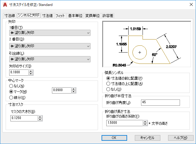 1 本目の寸法線の矢印を設定します。1 番目の矢印の種類を変更すると、それに合わせて 2 番目の矢印も自動的に変更されます。(システム変数 DIMBLK1[矢印名 1])