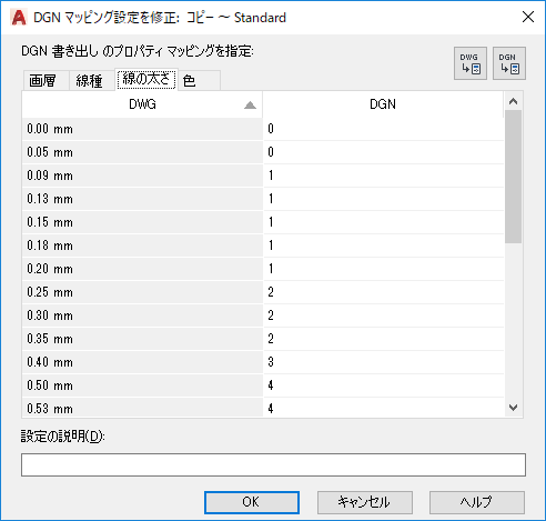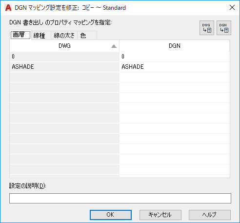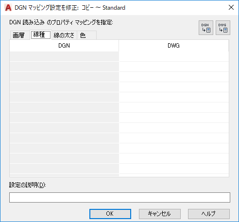 マッピング設定を書き出す: [DGN 書き出し設定]ダイアログ ボックスから新しい設定を作成して[DGN マッピング設定を修正]ダイアログ ボックスにアクセスすると、[DWG]列には、現在の図面ファイル内で定義されているすべての線種が一覧表示されます。目的のセル(右側の列)が空白の場合は、常に既定のシステム マッピングが使用されます。