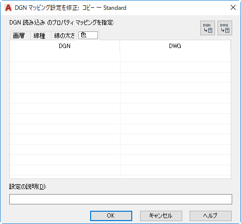 既存のマッピング設定: 既存のマッピング設定を編集している場合([DGN 読み込み設定]または[DGN 書き出し設定]ダイアログ ボックスを使用して Standard 以外の設定を編集している場合であっても)、マッピング テーブルに一覧表示されるプロパティは、読み込まれる DGN ファイルまたは書き出される図面ファイルから取得されません。