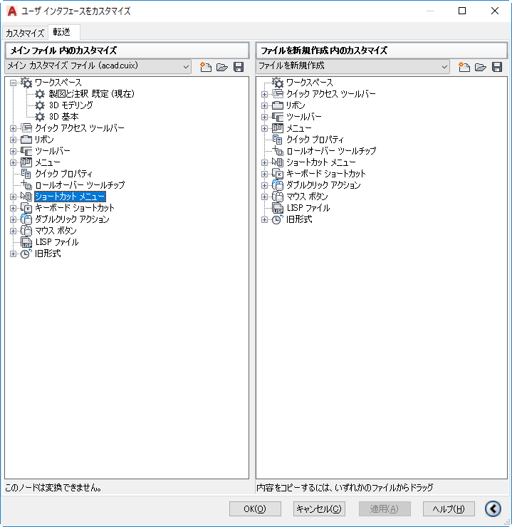 コマンド プロンプトで CUIIMPORT と入力すると、メイン CUIx ファイルが右ペインに表示されます(既定値では、AutoCAD ファイルの場合は acad.cuix、AutoCAD LT ファイルの場合は acadlt.cuix)。データを転送するには、CUI ファイルまたは旧形式のカスタマイズ ファイルを左ペインに開きます。コマンド プロンプトに対して CUIEXPORT と入力すると、メイン CUIx ファイルが左ペインに表示されます。データを転送するには、他の CUIx ファイルまたは旧形式のカスタマイズ ファイルを右ペインに開きます。