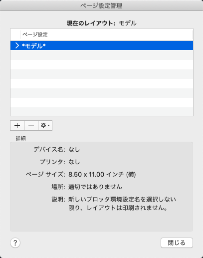 現在のページ設定が表示されます。別のページ設定を現在のページ設定にしたり、新しいページ設定を作成したり、既存のページ設定を修正したり、他の図面からページ設定を読み込みます。
