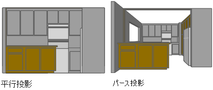 次の図は、同じモデルを平行投影とパース投影の両方で表したものです。どちらの図も、同じ視線方向に基づいています。