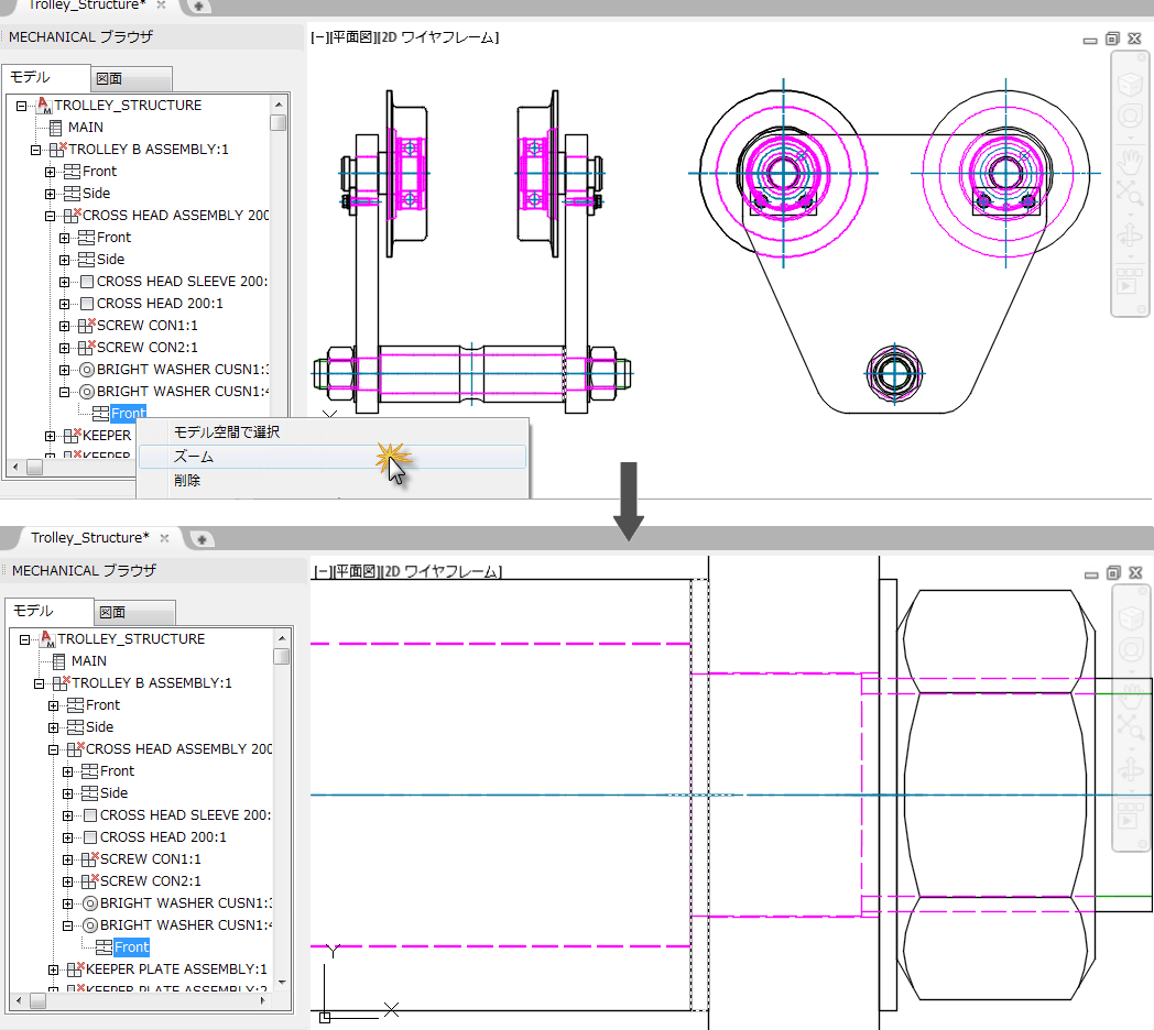 Mechanical ブラウザでコンポーネント、コンポーネント ビュー、またはフォルダを右クリックして[ズーム]を選択すると、図面領域に対応するオブジェクトが最大表示されます。