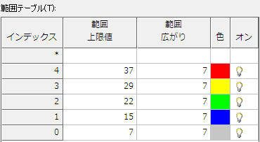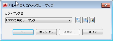 [パレットのカラー マップ定義]ダイアログ ボックスの[範囲テーブル]で、マップの各カラーが 86.57 m の高度範囲を表していることに注意してください。 [OK]をクリックし、ダイアログ ボックスを閉じます。 |