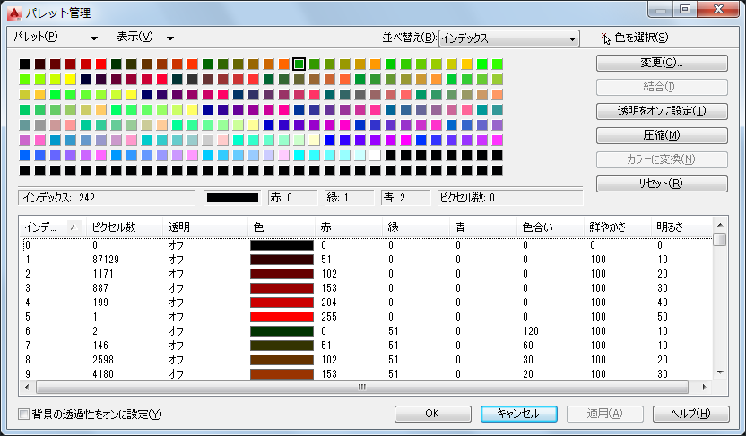 8 ビットのイメージ(256 色か階調グレー)では、パレット管理を使用して、色の変更、圧縮、結合と、背景の透過性の割り当て、またはグレースケール イメージをパレット カラー イメージに変換ができます。また、イメージ パレットを分析し、色の使用率や輝度ごとに表示することもできます。パレットの読み込みと書き出しで標準値を適用します。