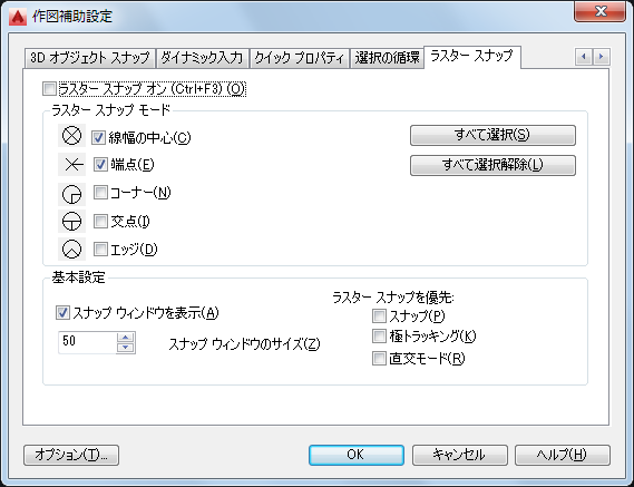 ラスター スナップがオン(有効)のとき、スナップ ウィンドウが AutoCAD カーソルの回りに表示されます。スナップ ウィンドウは、スナップできる点の上にクロスヘアを表示します。カーソルが終点、コーナー、その他の点にスナップするかどうかを管理するために、1 つまたは複数のモードが選択できます。