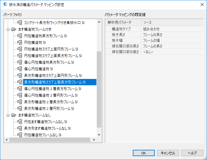 これらのパーツのマッピングをセットアップし、適用することにより、既定では[自然流下式ネットワークの解析]コマンド内でパラメータ値が使用可能になります。