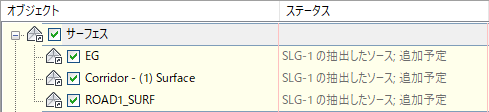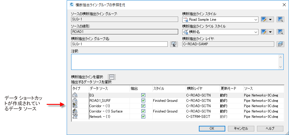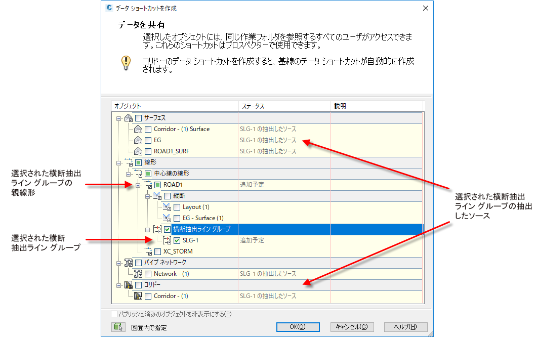 横断抽出ライン グループに対してデータ ショートカットを作成すると、[データ ショートカットを作成]ダイアログ ボックスの[ステータス]列に注記が表示され、図面内のどのアイテムが横断抽出ライン グループの抽出済ソースであるかが示されます。