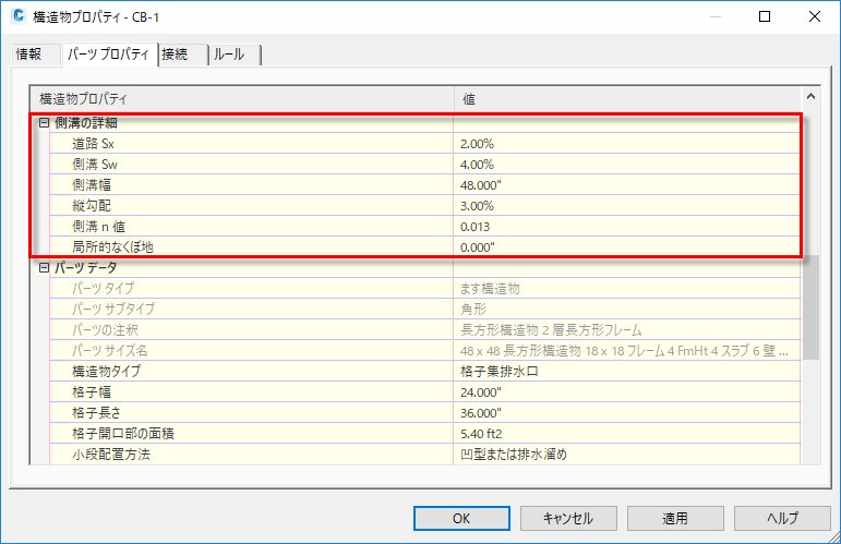 パーツ ビルダで作成されたパーツのパラメータを、[自然流下式ネットワークの解析]コマンドに必要なパラメータにマッピングできます。
