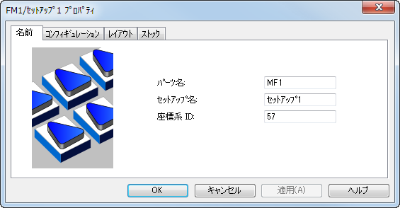 プロパティ ダイアログのタブには、各ダイアログ (セットアップ、座標系、コンフィギュレーション、 レイアウト、ストック) のオプションが含まれたタブが表示されます。