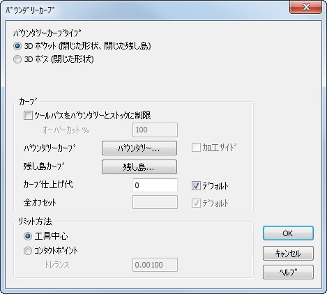 カーブ仕上げ代 - バウンダリー、または、残し島カーブからの距離を指定します。この値は、正の絶対値でなければなりません。
