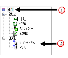 孔あけのツリー ビューは、フィーチャーの工程を表示します。