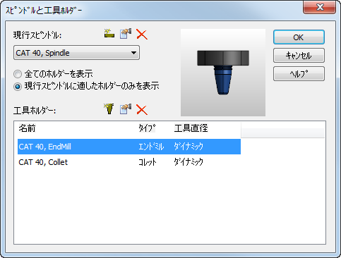 スピンドルと工具ホルダー ダイアログを使用して、スピンドルと工具ホルダーを表示、編集、作成します。