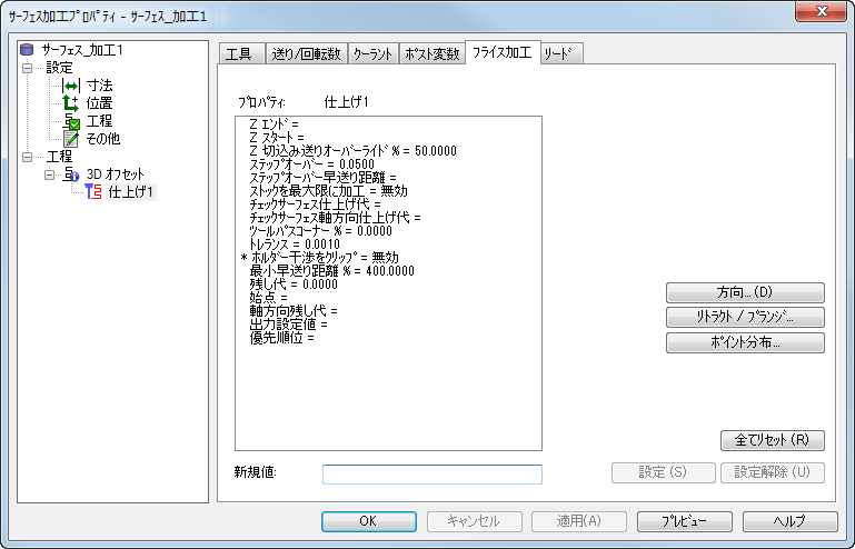 チェック サーフェス軸方向仕上げ代 - チェック サーフェス上に残しておく、軸方向(Z)の材料の量を入力します。チェック サーフェス軸方向仕上げ代 を設定した場合、チェック サーフェス仕上げ代 の値は、チェック サーフェスの径方向(XY)のみに適用されます。チェック サーフェス軸方向仕上げ代 が未設定の場合、チェック サーフェス仕上げ代 の値は、チェック サーフェスの軸方向と径方向に適用されます。正との、どちらの値にも指定可能です。