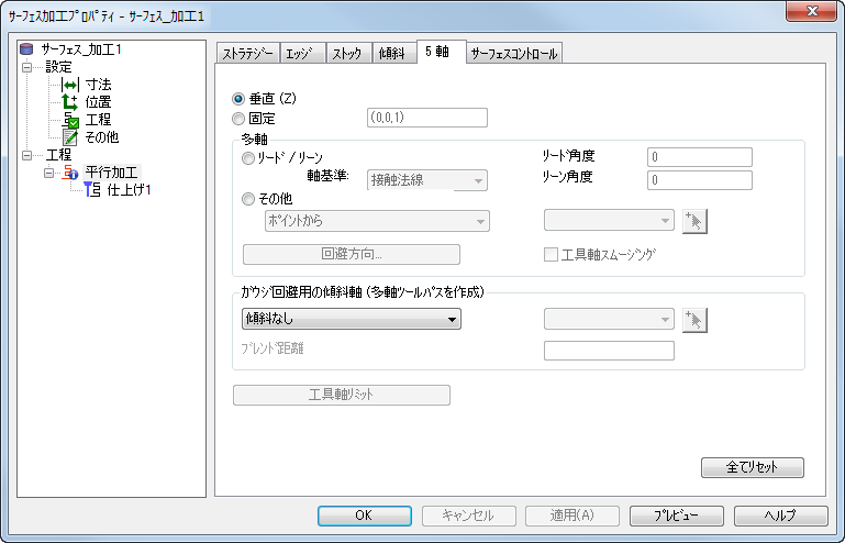 サーフェス加工プロパティ ダイアログの 5 軸 タブを使用して、サーフェス加工フィーチャーの多軸オプションを編集します。