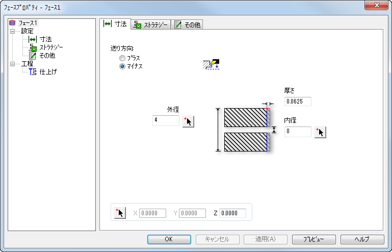 送り方向 - プラス X 方向に加工する場合は プラス、マイナス X 方向に加工する場合は マイナス を選択します。