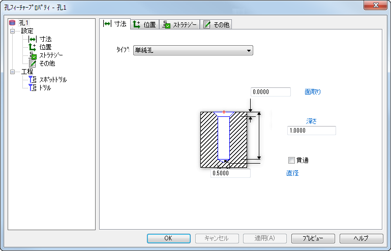 深さ - 孔の深さ(孔の先端部の長さは除く)を入力するか、「深さ」ラベル(青い文字)をクリックして、グラフィック ウィンドウで深さを選択します。