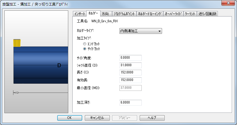 溝加工 / 突っ切り 工具の ホルダー タブには、次のプロパティがあります。