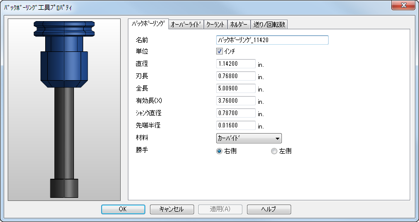単位 - 工具の寸法の単位です。インチの場合、インチ を選択します。このオプションが選択されていない場合、単位はミリメートルになります。
