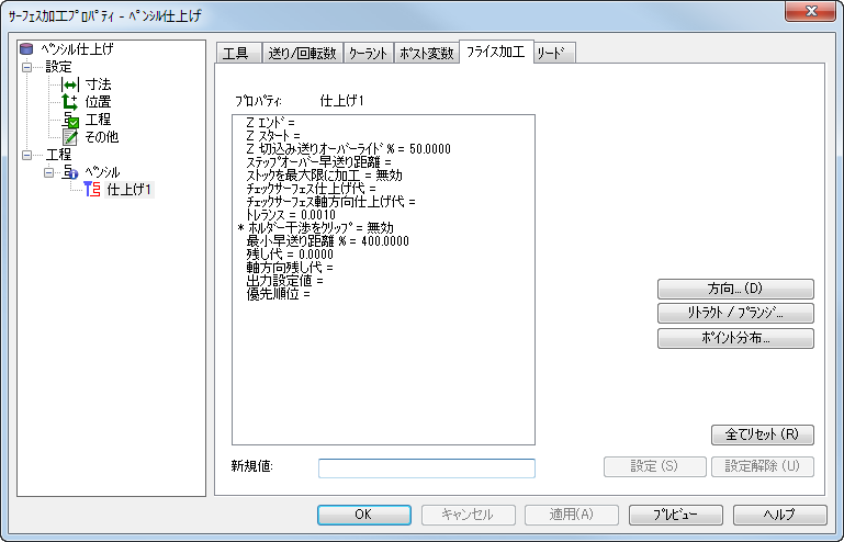 チェック サーフェス軸方向仕上げ代 - チェック サーフェス上に残しておく、軸方向(Z)の材料の量を入力します。チェック サーフェス軸方向仕上げ代 を設定した場合、チェック サーフェス仕上げ代 の値は、チェック サーフェスの径方向(XY)のみに適用されます。チェック サーフェス軸方向仕上げ代 が未設定の場合、チェック サーフェス仕上げ代 の値は、チェック サーフェスの軸方向と径方向に適用されます。正と負の、どちらの値にも指定可能です。