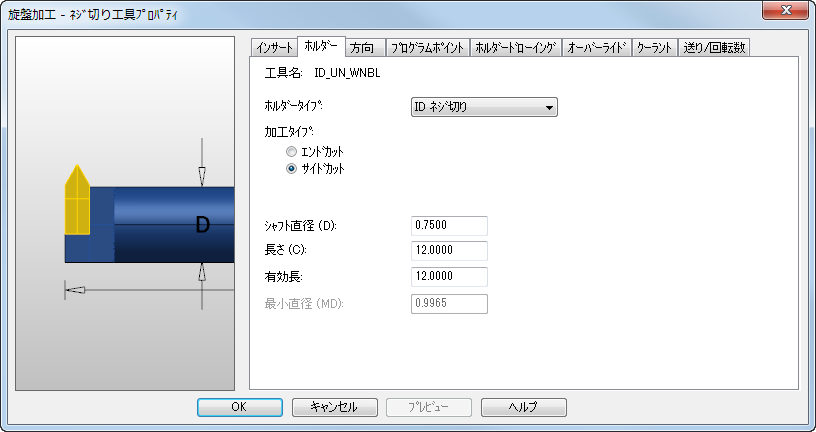 有効長 - シミュレーションの際に、工具が、ホルダーからどれだけ出ているかを示します。