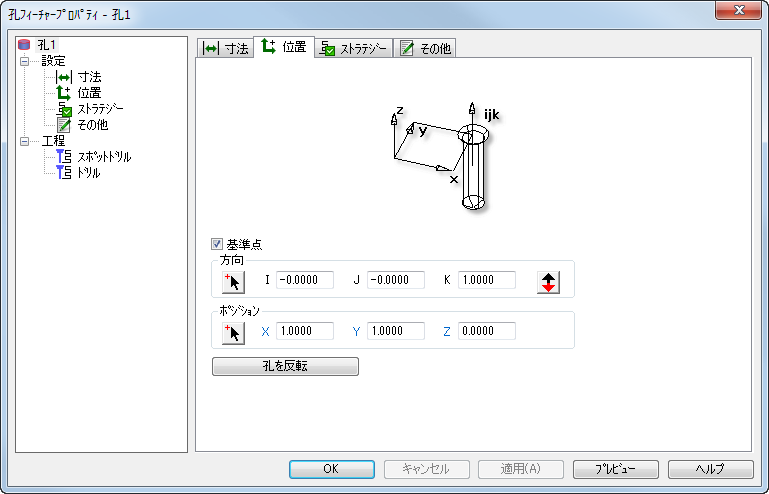ポジション - 孔フィーチャーの上部の座標を入力するか、位置を選択