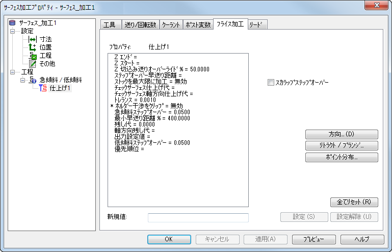 急傾斜ステップオーバー - パスからその次のパスへのステップオーバー値を入力します。 ツールパスの急傾斜領域に対する設定です。
