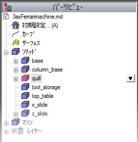 マシンの動作を設定します。最初の部位は、クイルです。パーツ ファイルで、クイルは単一のソリッドとして定義されています。パーツ ビュー と、グラフィック ウィンドウ(赤の箇所)に、quill が表示されています。