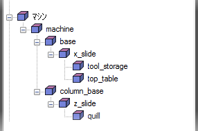 次に、ソリッド同士の、親と子のリレーションを設定します。次では、最初に設定するリンクを示しています。マシンは、column_base の主動部(親)です。この column_base は、z_slide の主動部(親)です。さらに、この z_slide は、quill の主動部(親)です。column_base が動くのにあわせて z_slide も動きます。また、z_slide が動くと、quill も動きます。