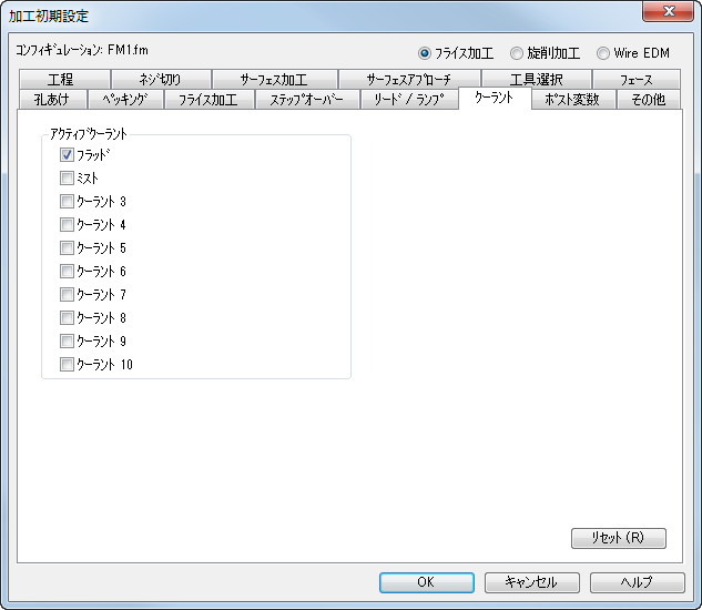 加工初期設定 ダイアログの クーラント ページを使用して、工程のデフォルト クーラントを指定します。