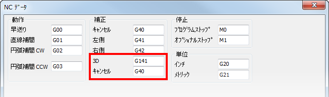 3D 工具径補正を使用するには、.cnc ファイルが、直線移動フォーマットの 3D 工具径補正をサポートしていなければなりません。次は、その例となります。