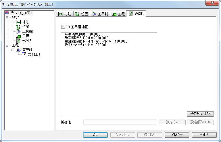 3D 工具径補正を使用します。3D サーフェス加工フィーチャーでは、3D 工具径補正は、コンタクト ポイントの方向に工具半径を補正します。つまり、補正は単純に右、または、左ではありません。 サーフェス加工プロパティ ダイアログの その他 タブを使用して、サーフェス加工フィーチャーの加工オプションを編集します。