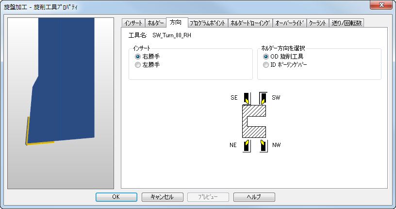 インサート - 工具の勝手 (右勝手、または、左勝手) を選択します。