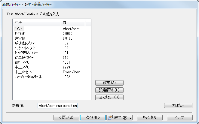 続行ラベル - テスト フィーチャーの後にプログラムを続行する場合の、NC コード内でのジャンプ先を入力します。Test Jump Label フィーチャーを使用して、新規ジャンプ ラベルを作成することができます。